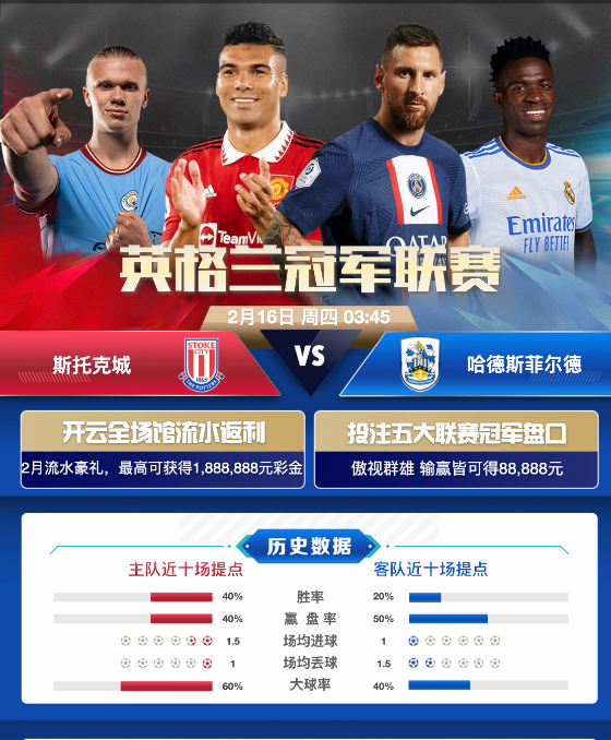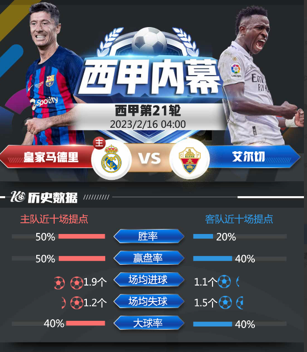 主队位列联赛积分榜第二位,整体实力更加雄厚,再加上球队刚刚获得世俱杯冠军,球队士气较为高涨。客队上轮西甲主场3比1大胜黄潜,成功止颓反弹。好博体育对于主队抱有较高期待,初盘便给出主队让2/2.5球,由于主队近期比赛较为密集,外界对于主队体能储备问题较为担心,数据方面并未给予有效支持,即时盘机构变更让球数,目前为主队让2球,并搭配超高水。两队往绩交手10场,皇马保持不败战绩,往绩心里优势巨大,再加上客队近期发挥并不稳定,本场比赛还是更加看好皇马主场再下一城!